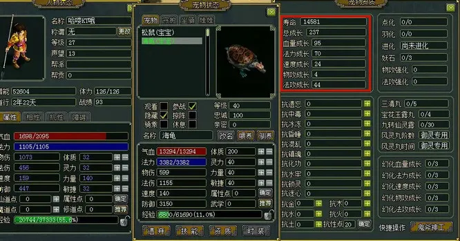 可以看到海龟宝宝的属性成长,血量成长为95,作为游戏初期的宠物,无疑是非常高的,可以在很多BOSS战中抗住输出帮助回复血量。抗性建议增加抗土和抗中毒,防止气血掉的太快。